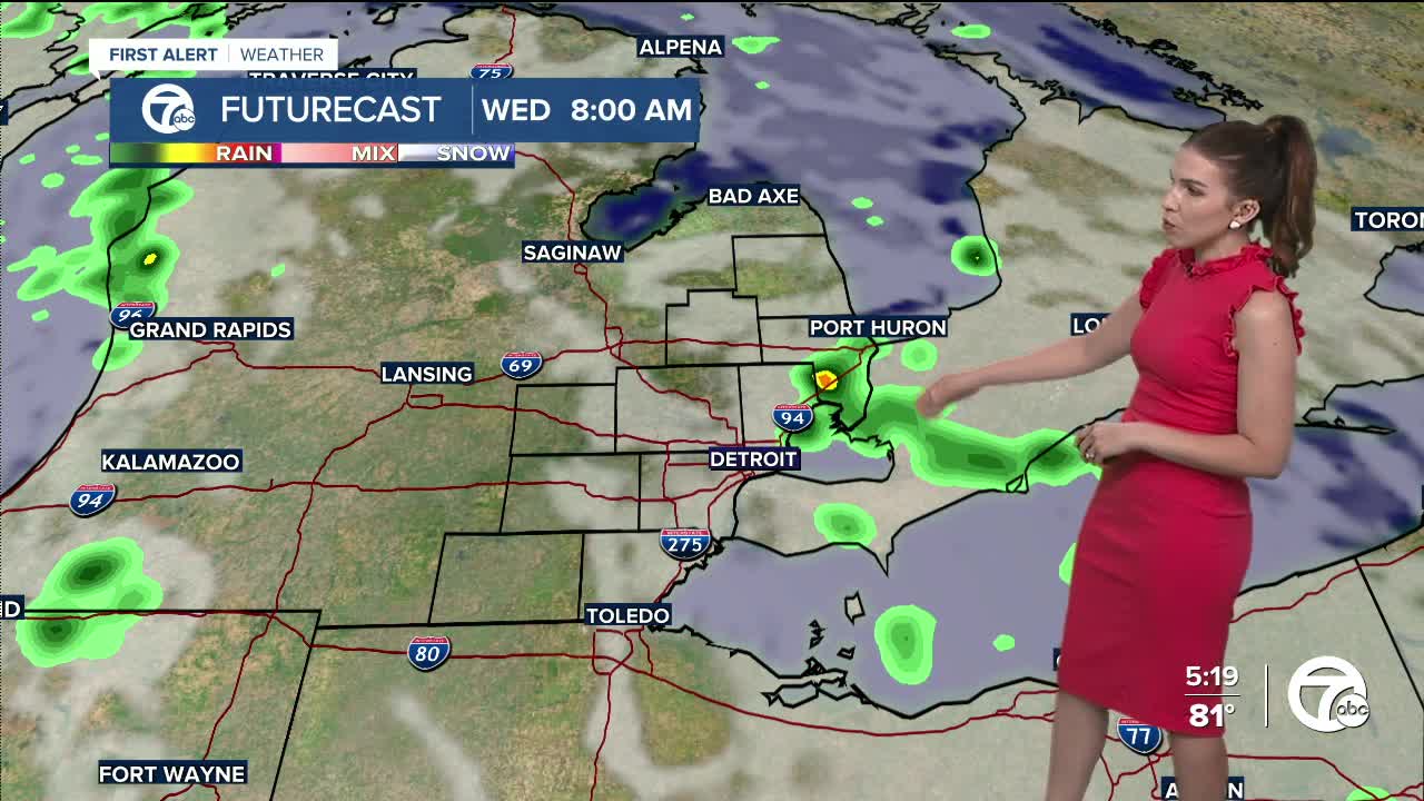DETROIT (WXYZ) — Showers and thunderstorms increase Wednesday as a cold front moves through. A few showers are possible in the morning, but most of the storms will move in after 3 p.m. A few storms may be strong to severe, with wind gusts 60 mph the biggest threat. It will be a breezy day overall with winds 10-20 mph. High temperatures peak in the low 80s.