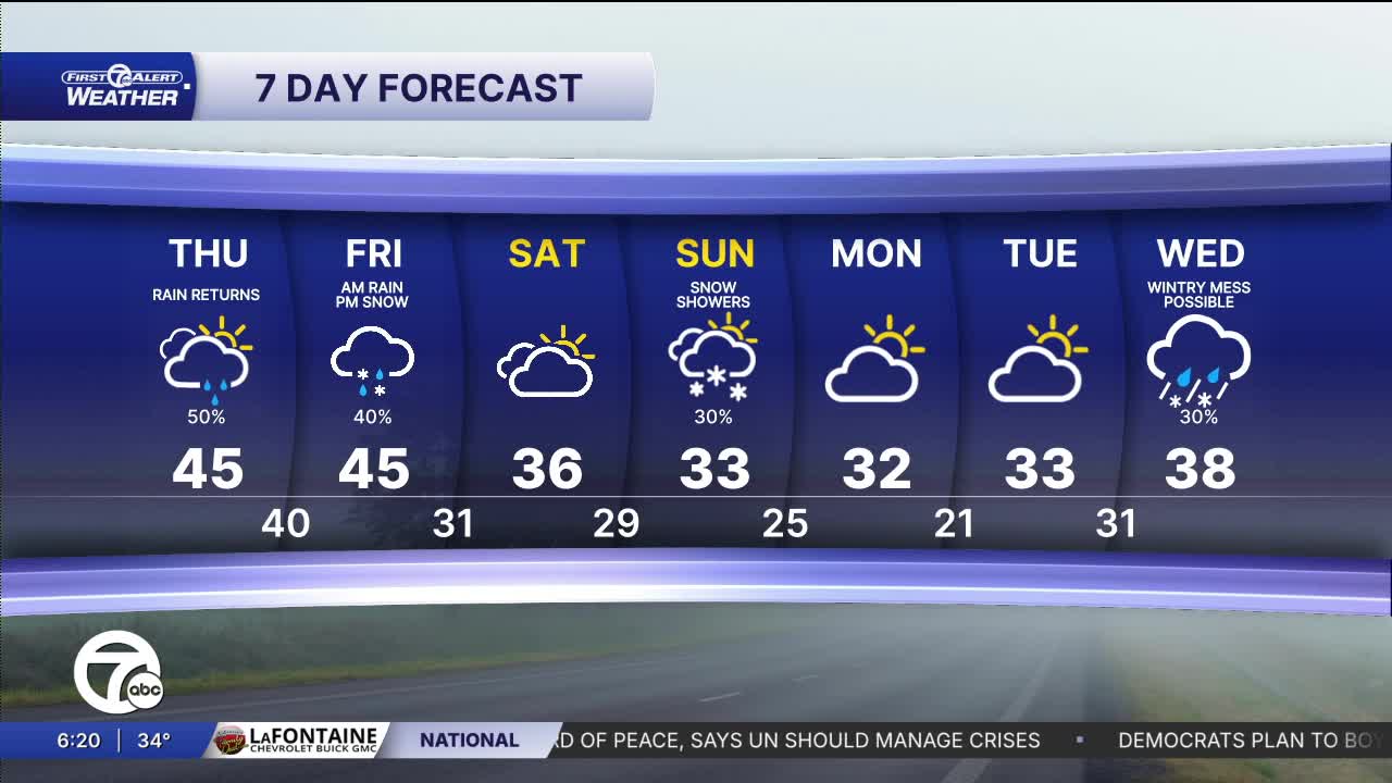 A mild and gray day is on tap across Metro Detroit with highs climbing into the mid 40s under mostly cloudy skies. Winds turn gusty out of the southeast. A few showers are possible and thunder is an option too. Moisture increases late with rain likely redeveloping tonight and continuing into early Friday. That means a damp start to Friday across the area with rain during the morning commute but temperatures briefly stay in the low 40s. As the system pulls away, winds shift and cooler air filters in, allowing readings to gradually fall back into the 30s through the afternoon and evening with lingering clouds as winter makes a comeback.
