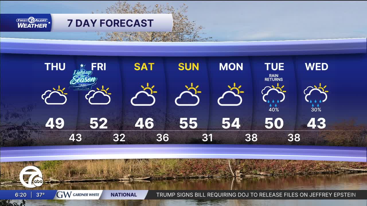 Friday will feature mostly cloudy skies again with another mild push of air, with a high near 52 and a relatively cool overnight low around 32. The abundant cloud cover will keep temperatures steady through much of the day, making it feel warmer than earlier in the week. This will make Light Up the Season in Downtown Detroit, cool but not cold this year.