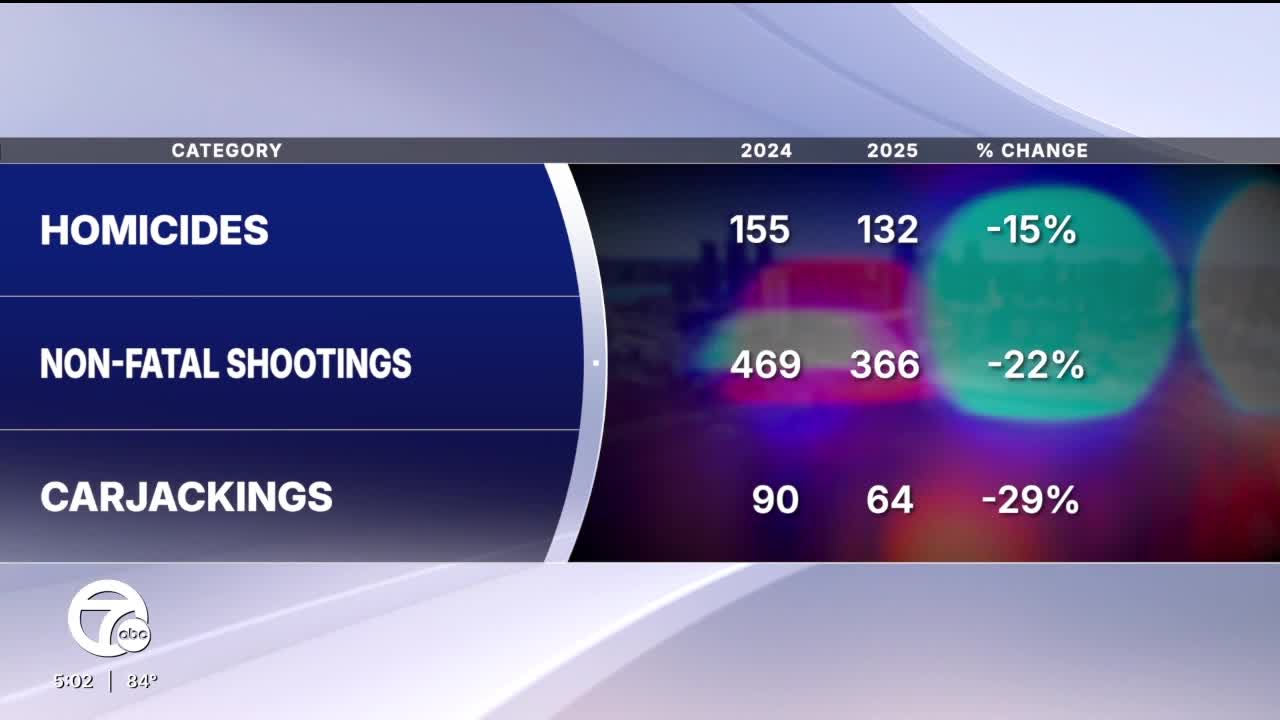 According to the latest numbers from the Detroit Police Department, there have been 133 homicides in the city of Detroit this year, down 15% from the same time period in 2024. There have also been 366 non-fatal shootings, which is 22% lower than the same time period in 2024 and 64 carjackings.