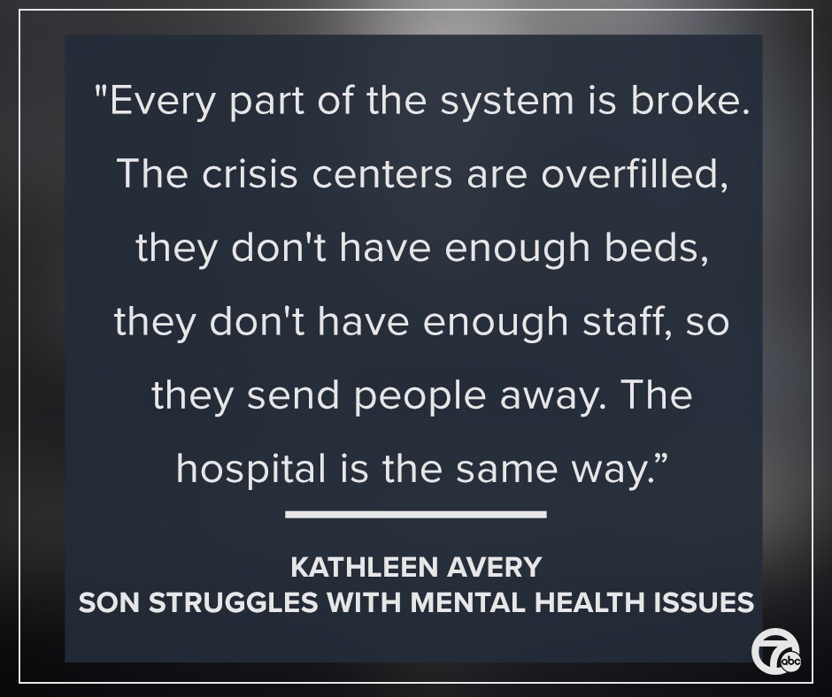 "My son has had several psychiatrists quit him. He's too high level, they can't provide the care that he needs, because he has displayed behaviors that have rearranged their offices. But they will send me a letter and say, 'but he needs to get in and get treatment so don't let that lag,'" said Kathleen Avery.