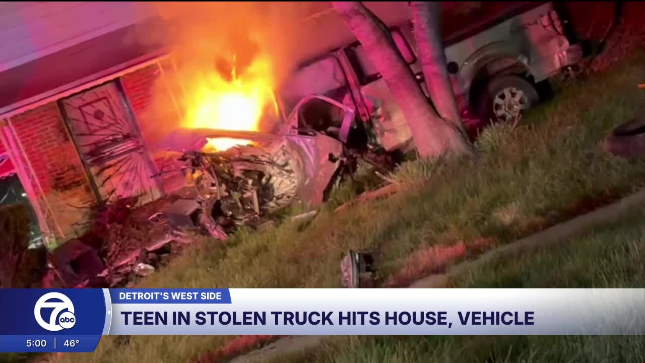 Teen crashes into Detroit home and innocent driver in stolen truck, sparking a fire