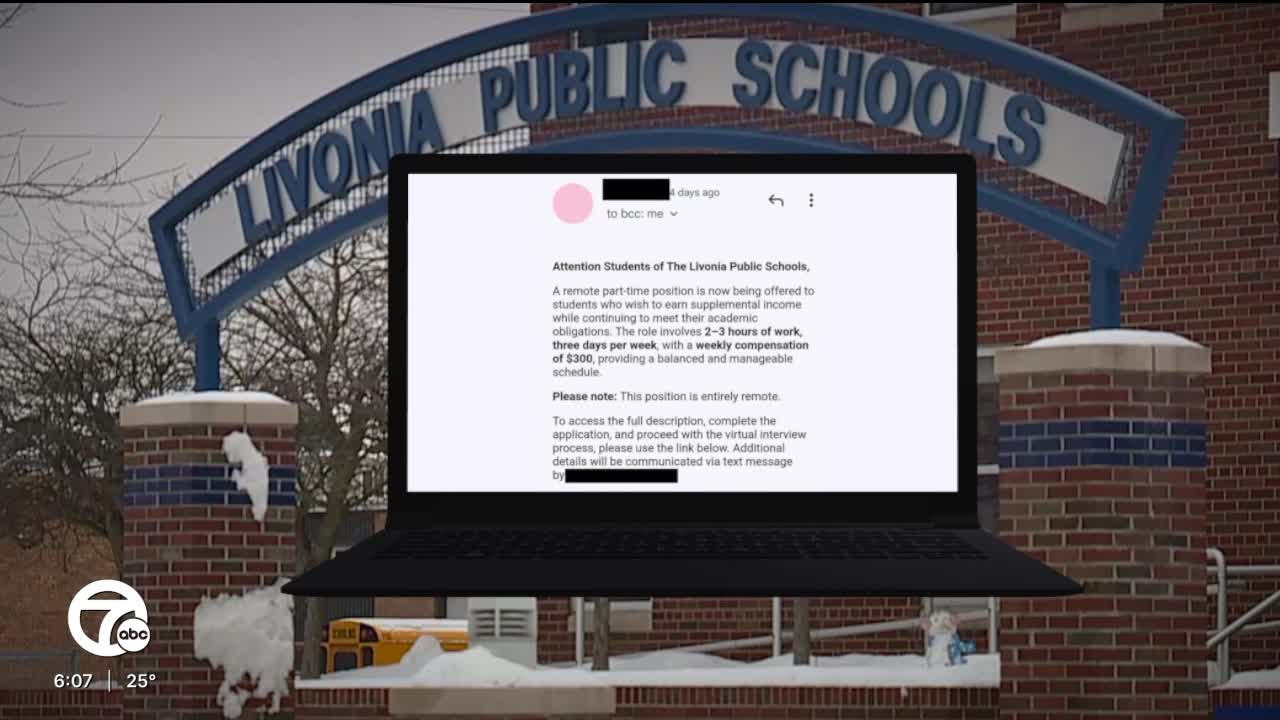 LIVONIA, Mich. (WXYZ) — A phishing email targeting Livonia Public Schools students promised $300 a week for remote, part-time work, but scammers were actually after sensitive personal and banking information.