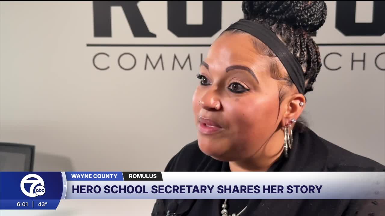 ROMULUS, Mich. — The Romulus Middle School secretary who helped prevent a potential tragedy earlier this week is speaking exclusively about the terrifying encounter that unfolded when a banned parent showed up at the school with a loaded weapon.