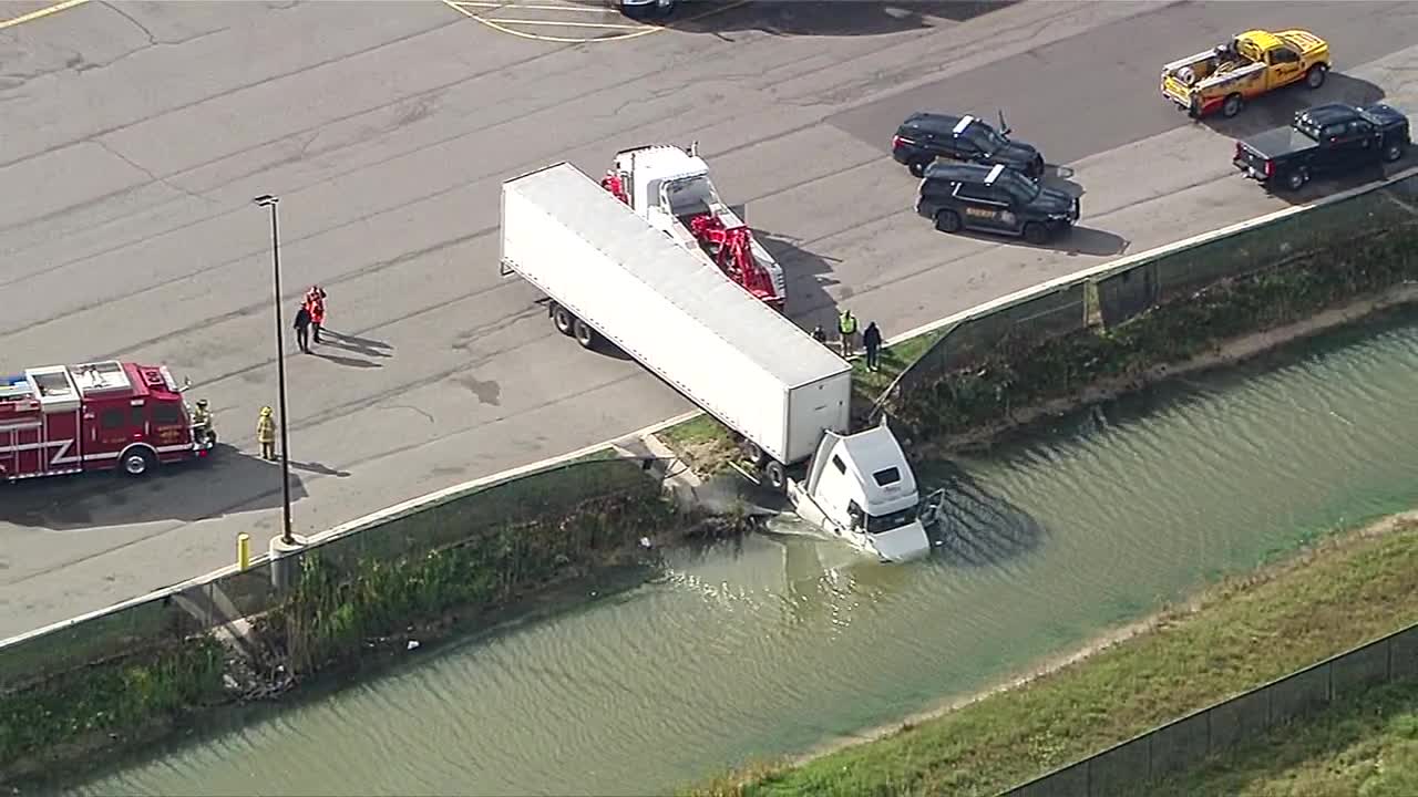 Semi rolls into retention pond at Love's travel stop in St. Clair County