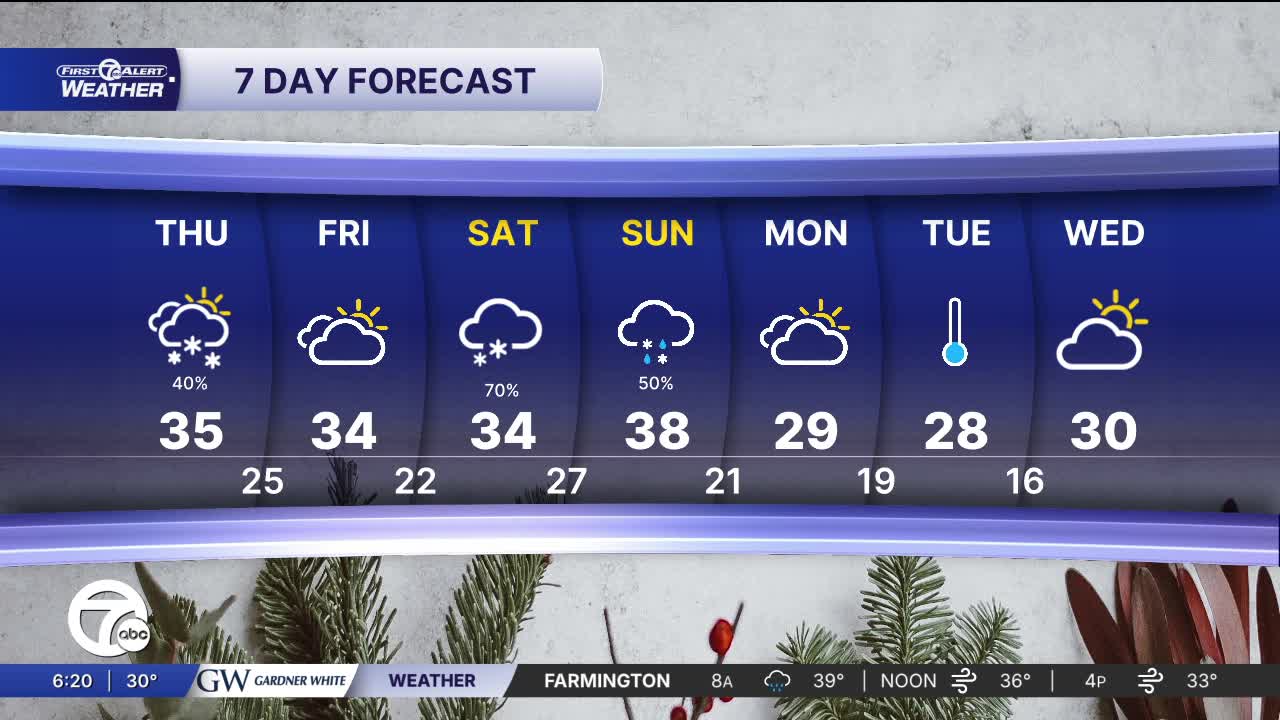 (WXYZ) — This afternoon we’re looking at mostly cloudy skies with a chance of a few flurries and snow showers as cold air settles in and conditions tighten up. It’ll feel chilly with temperatures in the mid 30s and a brisk wind making it feel like the teens for much of the day — so bundle up if you’re heading outside. Tonight into Friday morning, temperatures dip into the upper 20s, so any wet surfaces could freeze and make roads or sidewalks slick. Friday itself stays cold and mostly cloudy, with highs only around 34 and lows dropping toward 22. It’ll be breezy again but the wind isn’t expected to die down, which will make the day feel even colder than the actual temps shows. As for snow, there’s a chance that what develops later today could leave a light dusting to 2" in spots but nothing like a heavy winter storm. In short: the next 24–36 hours are your window for fewer weather issues. Big changes arrive for the weekend, that could disrupt travel.