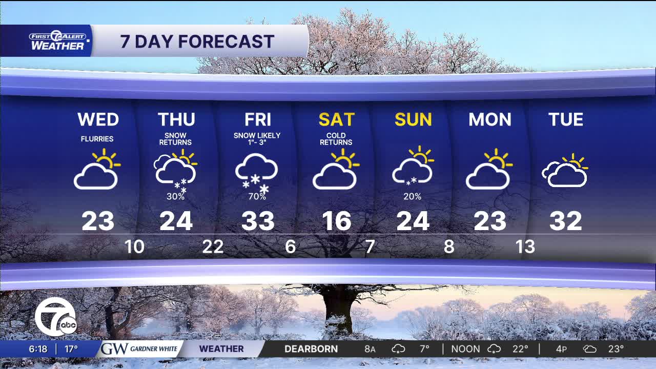 On Thursday, the cold continues with mostly cloudy conditions and a few snow showers in the afternoon. Highs remain in the 20s. By Friday, snow showers increase in the morning leading to accumulating snow across Metro Detroit. As of now, snowfall totals will be around 1-2". Highs climb into the low 30s.