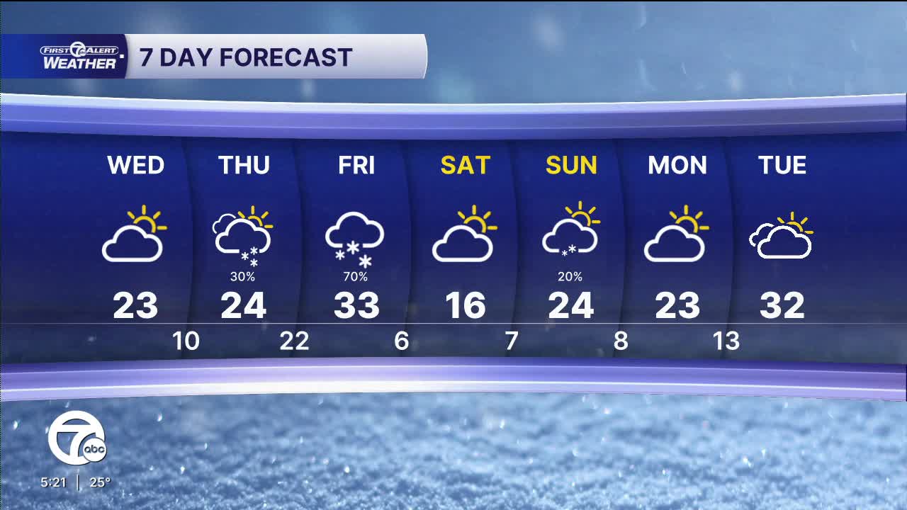 On Thursday, the cold continues with mostly cloudy conditions and a few snow showers in the afternoon. Highs remain in the 20s. By Friday, snow showers increase in the morning leading to accumulating snow across Metro Detroit. As of now, snowfall totals will be around 1-2". Highs climb into the low 30s.