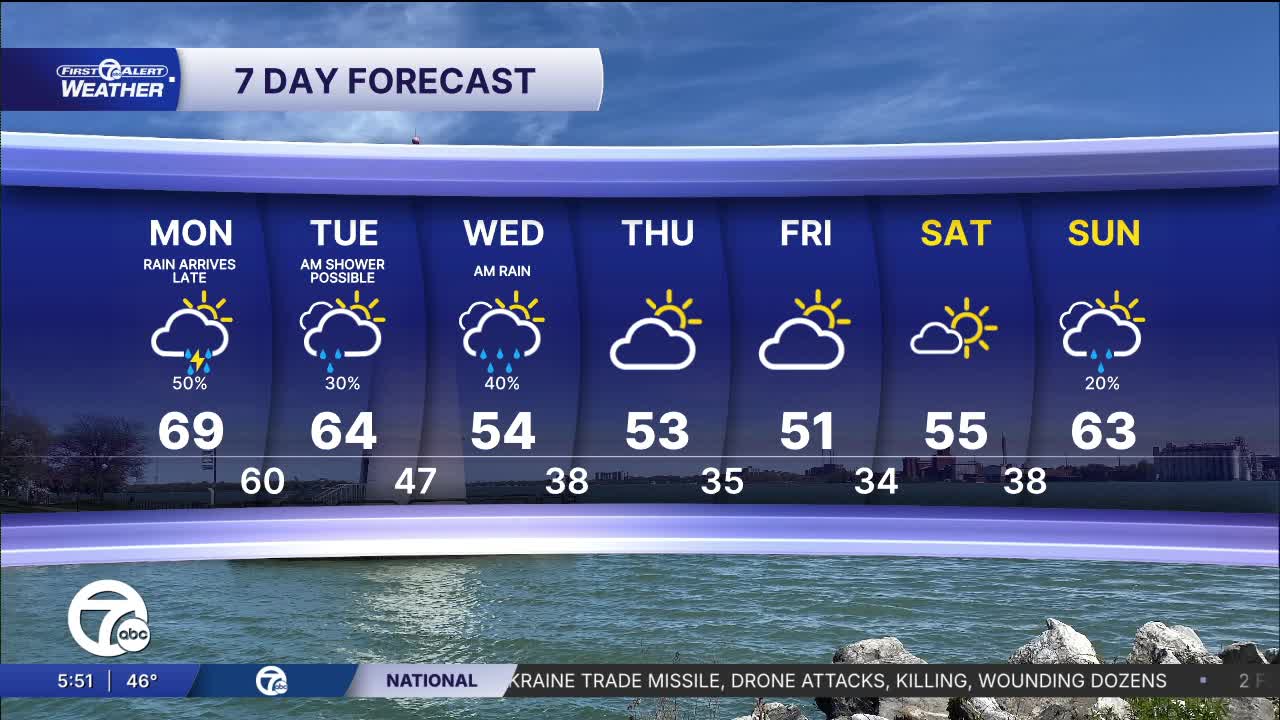 Temperatures warm today, with highs near 70°. With that comes the chance for showers and storms, mainly tonight into Tuesday morning. Severe weather is low as the rain and storms drift this way - something we'll monitor. Temperatures begin to drop back down starting Tuesday, with highs in the mid to upper 60s.