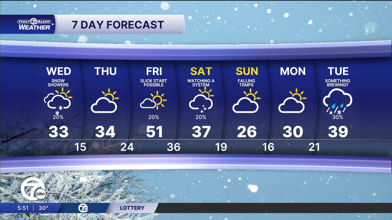 A few snow showers could linger Wednesday morning with highs in the low to mid 30s.
