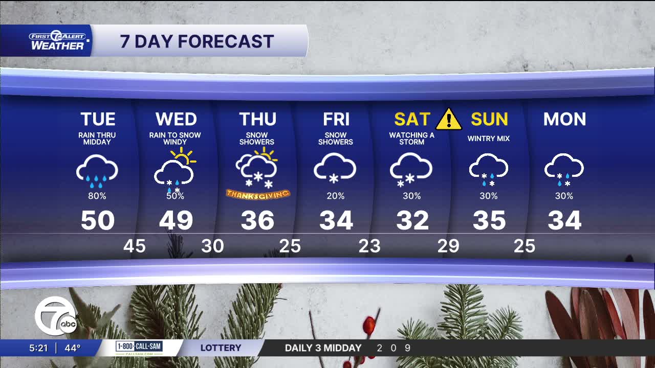 Today thru mid-week, Metro Detroit holds on to a milder, mostly cloudy pattern before a much sharp wintry change arrives for Thanksgiving and Black Friday. Today brings more clouds and some light to moderate rain as a weak system slides through, keeping temperatures in the lower 50s but signaling that changes are on the way. The best chance of rain will be in the morning but most areas will be able to get to work and school before it really picks up. By Wednesday, things turn windy and unsettled with a couple of showers and falling temperatures later in the day as colder air starts pouring in. Thanksgiving Day, will feel completely different with highs in the mid-30s, a stiff breeze, and the chance for a flurries or snow showers as the colder air settles in over the Great Lakes. Black Friday stays firmly on the chilly side with highs in the mid-30s, clouds mixing with limited sun, and the kind of brisk, wintry feel that makes you reach for gloves or a heavier coat. Overall, the quiet, mild start to the week gives way to a much colder holiday stretch.