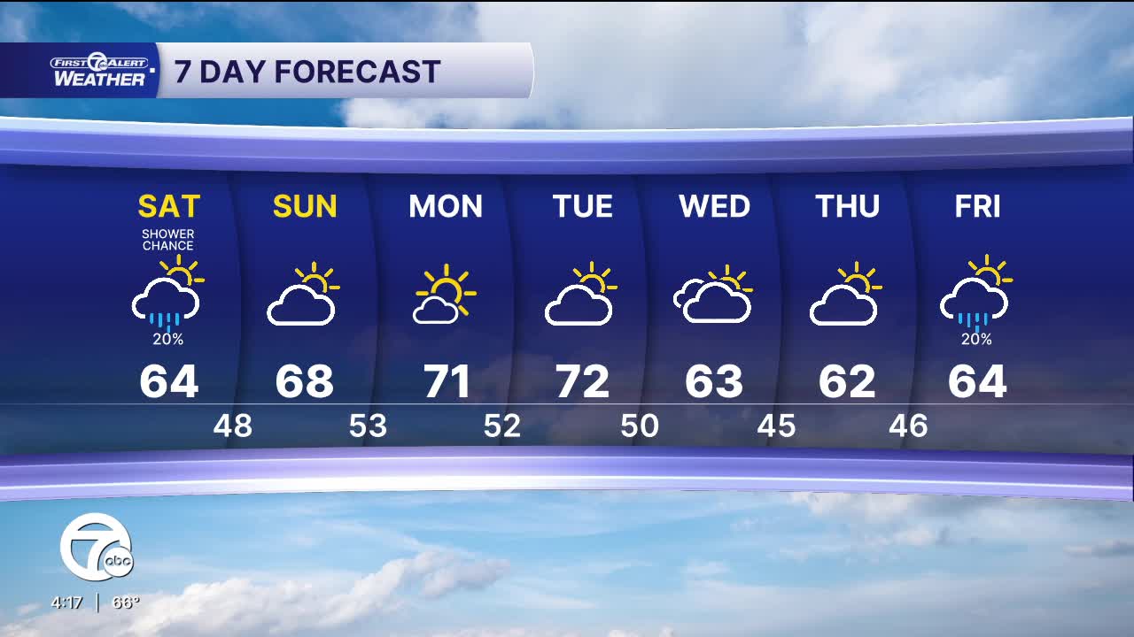 A weak storm system will bring spotty showers Friday night. The chance for showers is very low, with most of us looking and cloudy skies and lows in the low 40s by Saturday morning. The storm system will spin over Canada through the day Saturday, keeping a slight chance for a shower here in southeast Michigan through the day. Outside of the shower chance, you can expect partly sunny skies and highs in the mid 60s.
