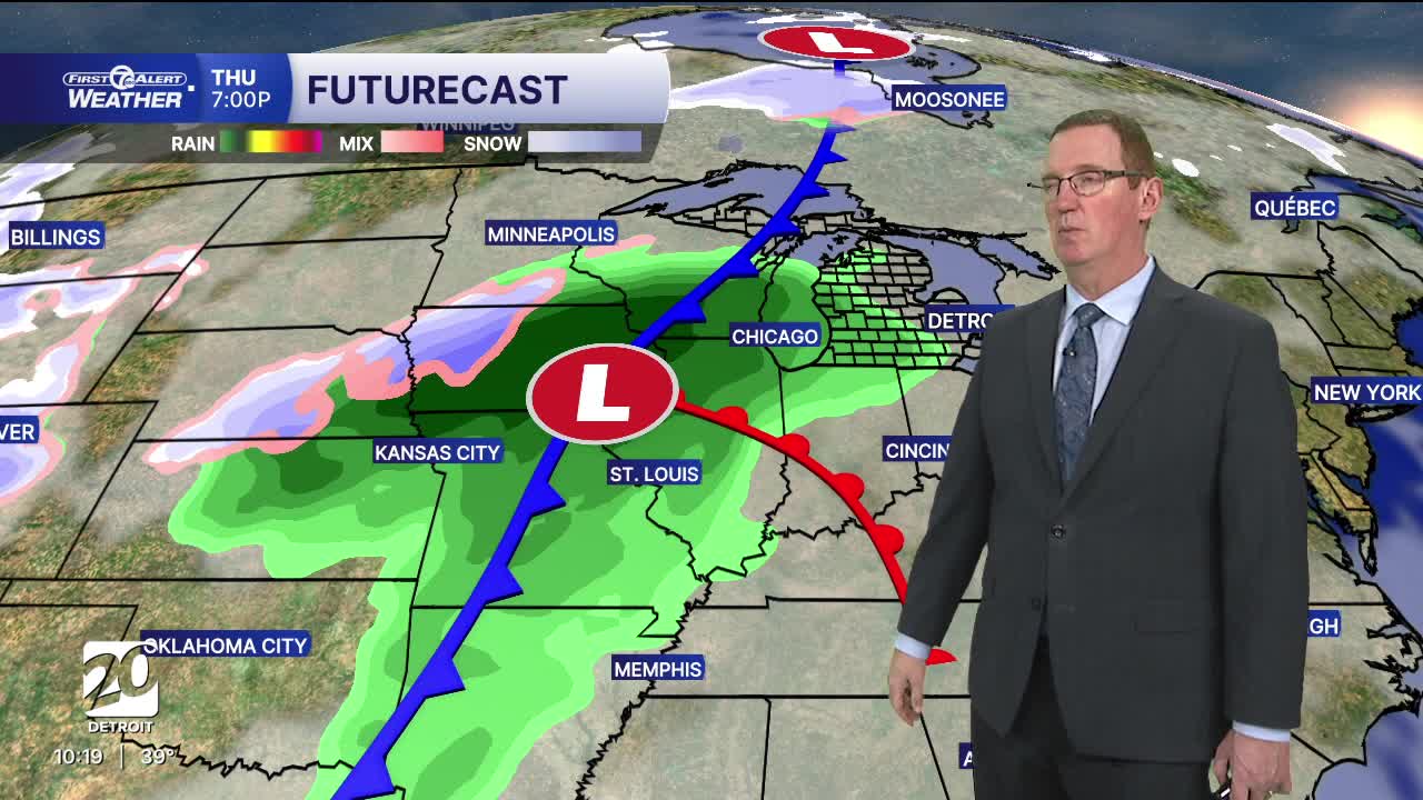 Tonight: Mostly cloudy with more fog possible and temps around 32° or just below. Freezing fog could become a concern in spots outside the city of Detroit. Winds: S 5-10 mph.