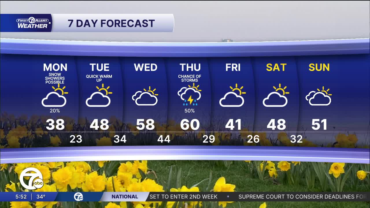 A colder pattern has settled into Southeast Michigan today with high temperatures generally ranging from the low to upper 30s—around 38° in Detroit, 37° in Ann Arbor, and closer to 33° near Port Huron and Port Sanilac. Expect scattered snow showers at times along with breezy conditions, as north-northwest winds around 10–15 mph add a chill to the air. Overall, it’s a below-average day compared to the typical high of 49°, reinforcing a wintry feel despite the late-season timing.