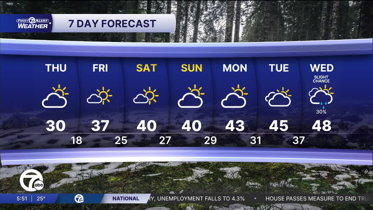 Detroit starts off on the chilly side today with a mix of sun and clouds and highs around 30° - but we begin a steady warming trend heading into the weekend. Friday climbs to the upper 30s with a bit more sunshine, followed by highs near 40° on Saturday & Sunday under partly sunny skies.