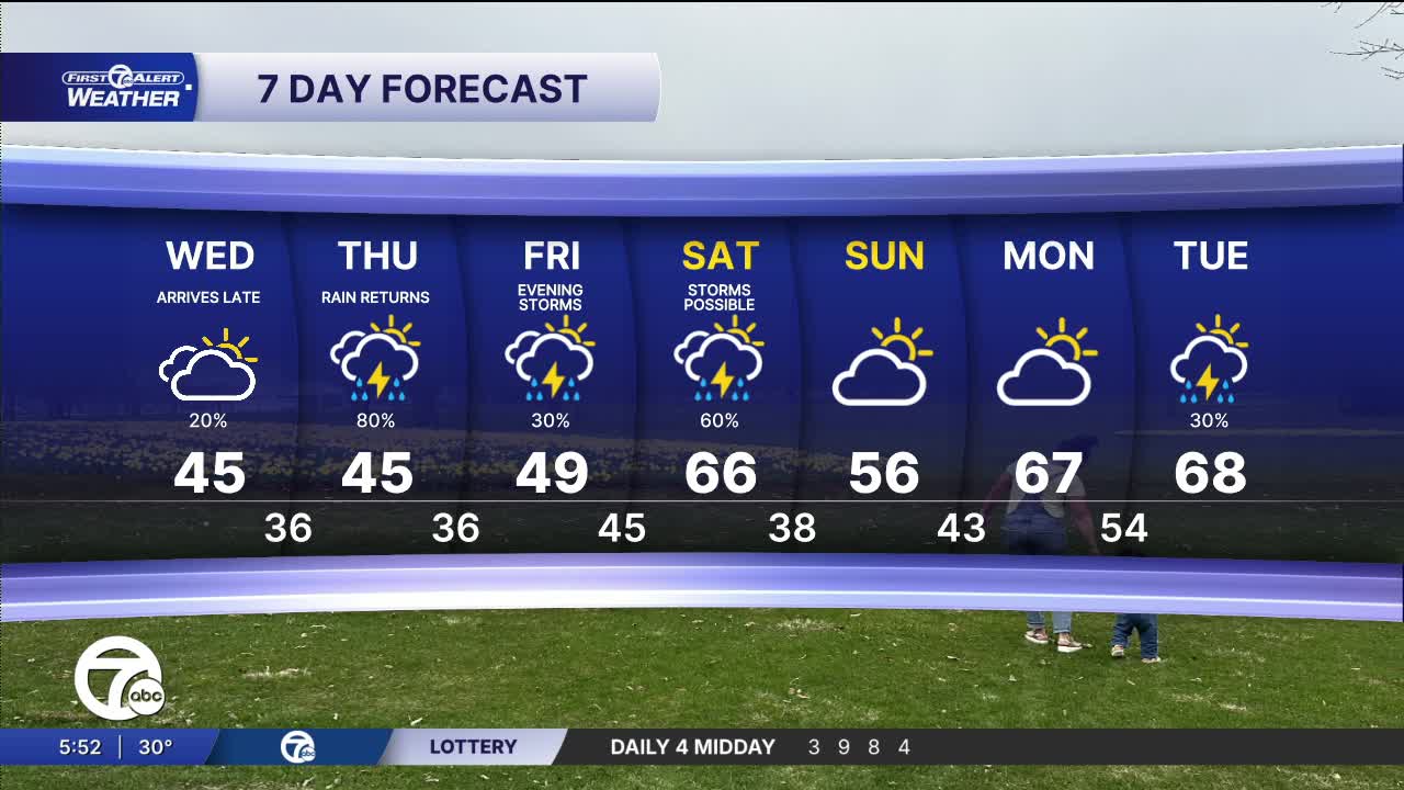 Wednesday does look like one of the quieter days this week with mostly cloudy skies, morning temps in the mid-30s and the potential for patchy fog early. Visibility could briefly dip around sunrise before gradually improving mid-morning. Afternoon highs should climb into the mid-40s. While a stray shower can’t be ruled out late, much of the daytime period trends drier compared to the more active pattern setting up later in the week.