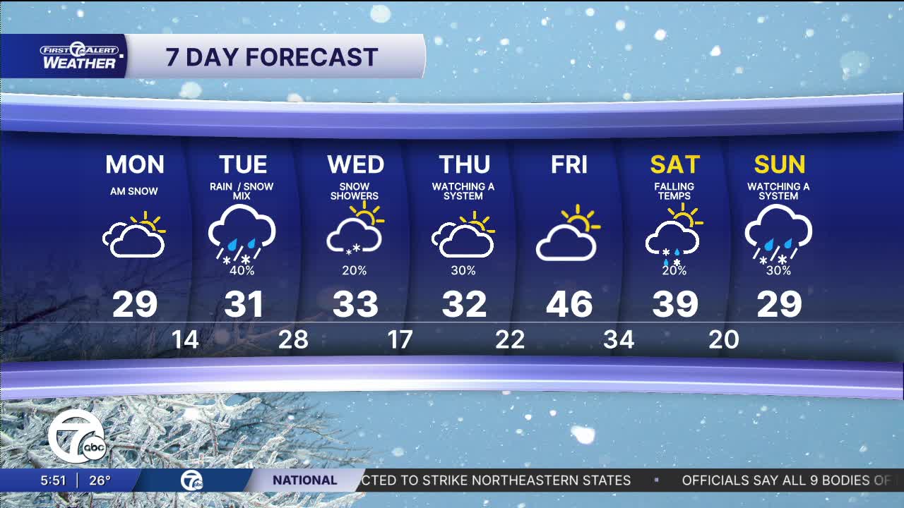 After the Tuesday night system exits early Wednesday, the rest of the week settles into a fairly quiet late-February pattern across Metro Detroit. Wednesday looks mostly cloudy and cool, followed by a weak system Thursday that could bring a few spotty light snow showers with minimal impact - based on the latest track. A milder push arrives Friday into Saturday with highs climbing into the upper 30s and 40s and mainly dry conditions. After the quick spike in temps, the number will fall quickly back into the 30s setting us up for another cold day. By Saturday night into Sunday, colder air returns with the next disturbance — and there is a signal for some accumulating snow on Sunday. At this point it looks like something to watch as we head into the weekend.