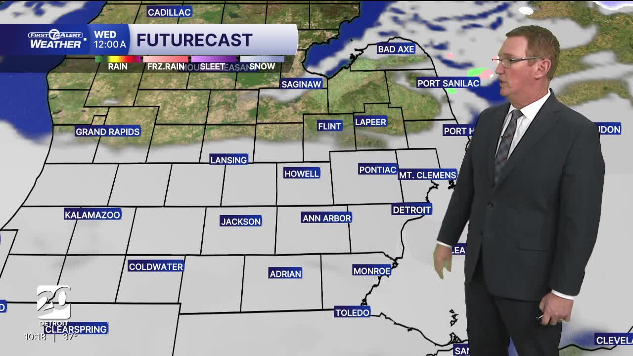 Clouds will break overnight from north to south. Since skies clear first in the north, these areas will be coldest in the morning in the mid 20s. Around Detroit and south it will be closer to 30°. It will be a brighter day tomorrow. There will be more sun in the morning than in the afternoon. Highs will be a few degrees higher than Tuesday and that trend will continue into the weekend with low 50s possible Friday and Sunday.