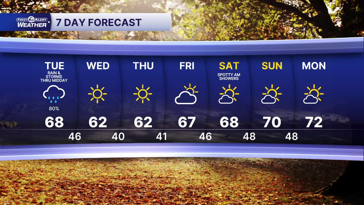 Today: Storms and rain possible early with lingering showers into the afternoon. Highs in the mid to upper 60s. Winds: SW/NW 5-10 mph.