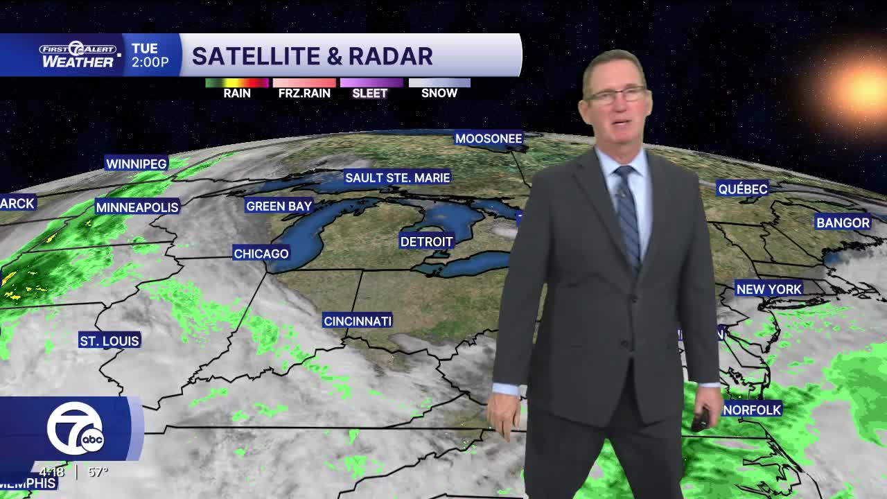 Clouds will slowly increase Wednesday as a storm system moves out of the Ohio River Valley and into the Northeast. We'll be on the edge of this system, bringing rain showers across Metro Detroit late Wednesday night/Thursday morning. Rain showers will continue Thursday, but taper down throughout the day. Highs climb into the low 50s.