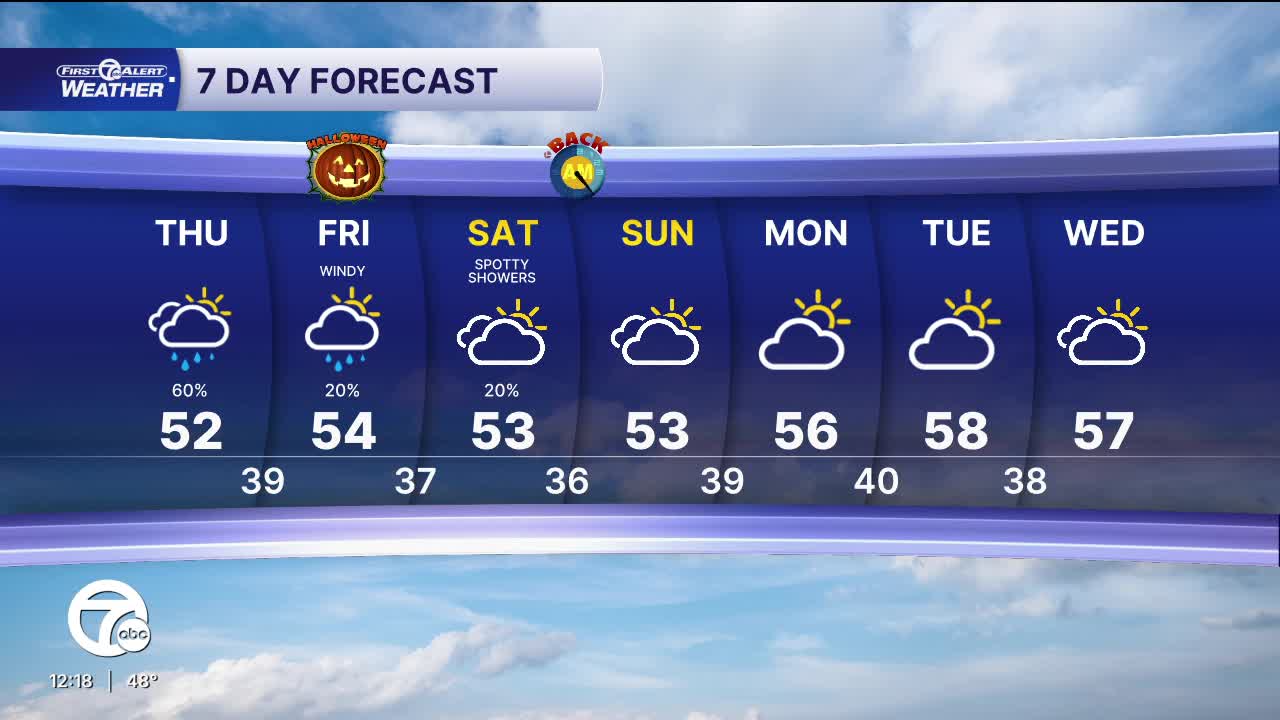 Today: Rain chances with a bit more east than west. Highs will be in the low 50s in Detroit. Winds: NNE 12-25 mph.