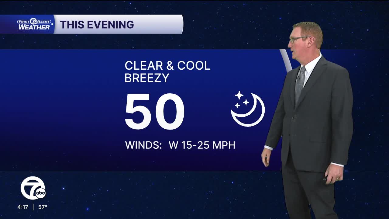 Tuesday: Partly sunny with highs in the upper 50s and 58° in Detroit. Winds: WSW 10-20 mph.