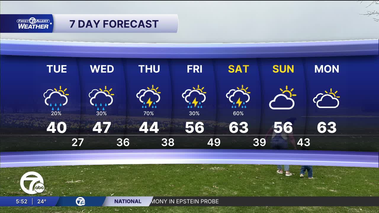 Mostly cloudy skies will dominate across Metro Detroit with a chilly start this morning and temperatures gradually climbing through the 30s this afternoon. Some areas could briefly touch around 40° if we get limited thinning in the cloud cover, but overall it stays on the cool side. Roads are generally dry, though there may have been a few slick spots early depending on the freezing rain potential. Winds remain light and the day stays quiet with no significant precipitation expected.