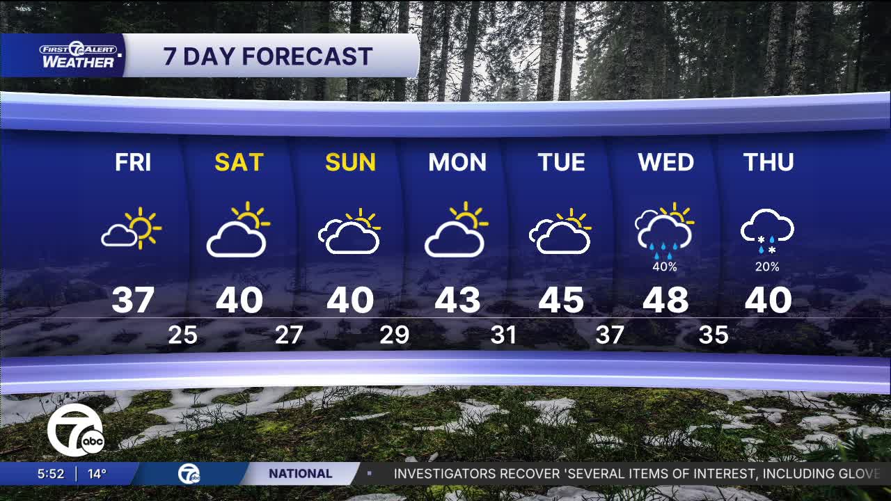 Today: Partly to mostly sunny with highs in the upper 30s. A few spots around US23 may get to the low 40s. Winds: SW 5-15 mph.
