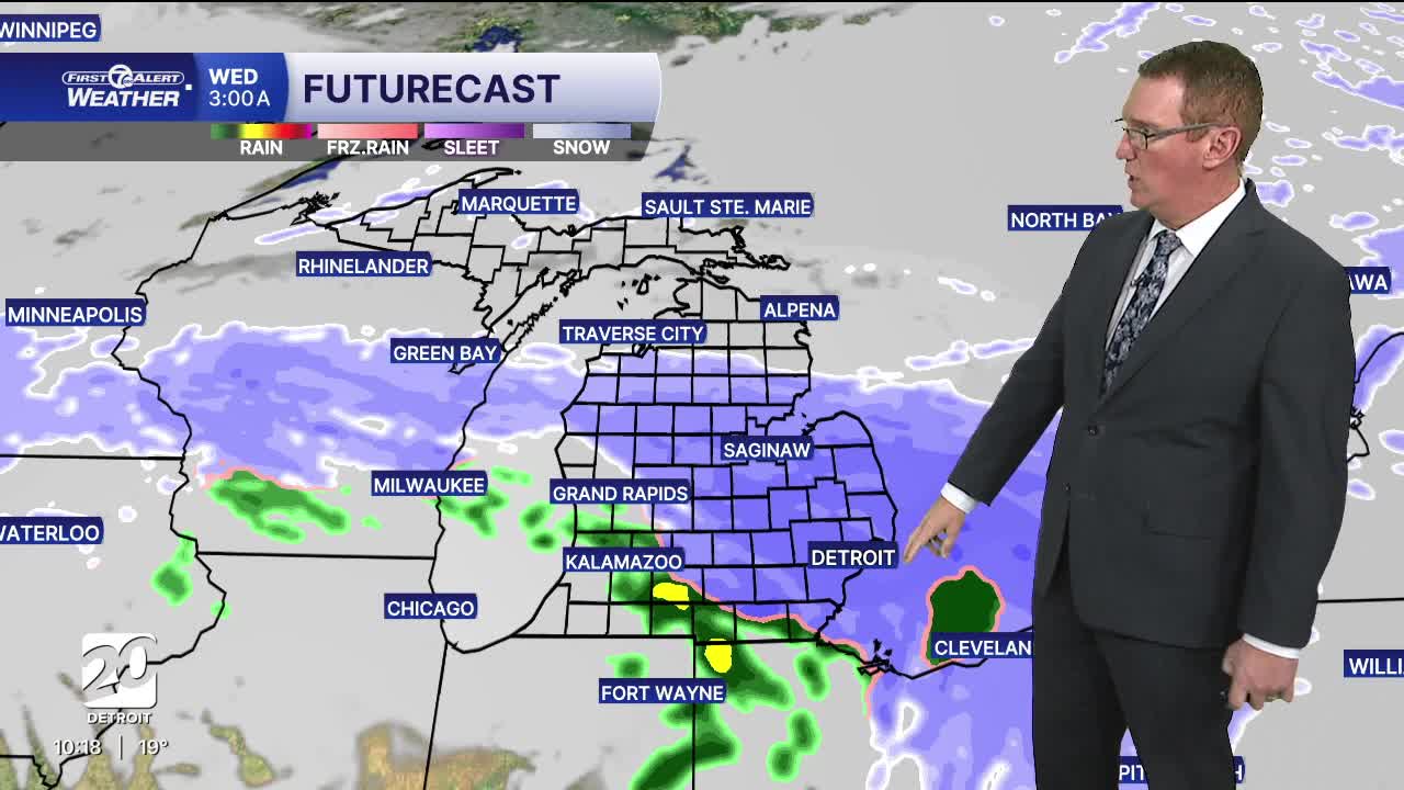 Tuesday: Snow returns to the area in the morning, which could make the roads slick. 1" - 2" of snow is possible north of Detroit with less than an inch around Detroit south. Highs reach the low 30s to mid 30s with 35° in Detroit. Winds: SW 15-25 mph