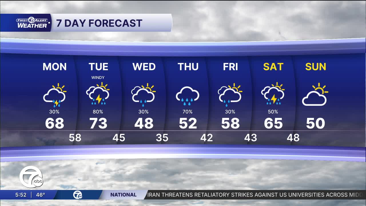 Steadier rain moves in Thursday, with a chance for a wintry mix north. High temperatures climb into the low 50s. Rain continues into Thursday night, before wrapping up Friday morning. Rain showers could impact tailgating for the Tigers' home opener, but should be wrapped up by the first pitch. Highs climb into the upper 50s by the afternoon.